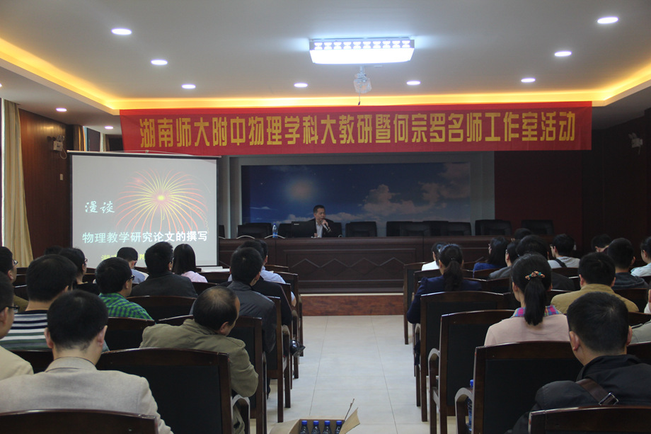 2015年4月23日,湖南师大附中物理学科大教研暨何宗罗名师工作室活动在附中博才南校区开展,附中本部及多元校区的80多位物理老师参加此次活动。此次活动由何宗罗特级做《漫谈物理研究论文的撰写》的专题报告,报告内容详实,理论水平高,可操作性强,有很强的指导意义。何特强烈呼吁青年物理教师要注重培养教学科研意识,多写教研论文,提升自身学科素养。