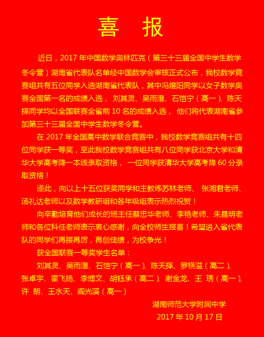 在2017年中国数学奥林匹克(第33届全国中学生数学冬令营)比赛中,我校数学竞赛组学生在教练组、班主任的精心指导下,奋勇拼搏、再创辉煌,共有5人入选湖南省代表队,其中冯煜阳同学以女子数学奥赛全国第一名的成绩入选,刘其灵、吴雨澄、石恺宁(高一)、陈天择同学均以全国联赛全省前10名的成绩入选,他们将代表湖南省参加第33届全国中学生数学冬令营。