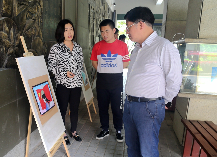 美术备课组组长杨爱霞老师向观众们介绍了此次作品展的来源和画展筹备过程,结合作品解读其表现特点和审美效果,并简单介绍了四个视觉艺术社团的发展状态和未来规划。黄月初认真观展,对学生们的创作表示赞赏,并鼓励要继续推动学校的美育建设工作。