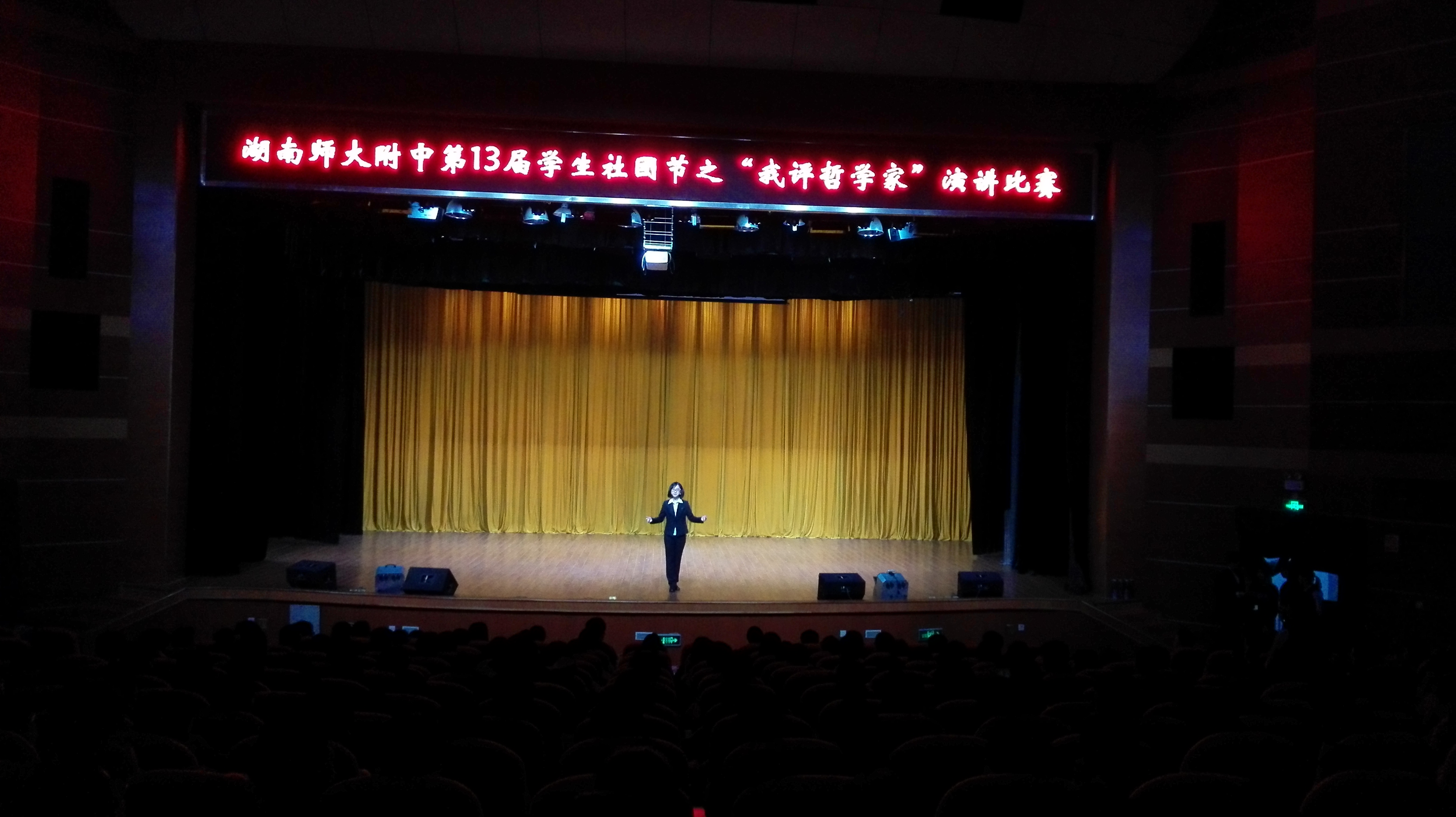 4月7日晚,第13届学生社团节之“我评哲学家”演讲比赛决赛在学生活动中心举行。学生发展处主任郭在时、副主任黄雅芩,团委书记吴卿,高二年级组长李勇、党支部书记陈兵,高一年级组长袁建光,政治教研组组长唐海燕,哲学社指导老师杨玉茜,高一年级政治老师游淑雲担任本次活动的评委。湖南师范大学万丹教授应邀担任点评嘉宾。