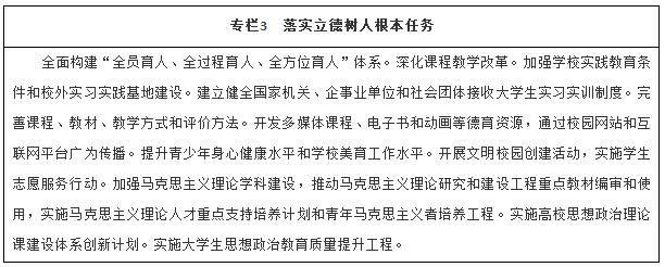 教育质量全面提升。教师素质进一步提高,学校办学条件明显改善,教育信息化实现新突破,形成信息技术与教育融合创新发展的新局面,学习的便捷性和灵活性明显增强。教育教学改革取得重要进展,学生的思想道德素质、科学文化素质、身心健康素质明显提高,社会责任感、法治意识、创新精神和实践能力显著增强,学业水平和自主学习、终身学习能力全面提升。