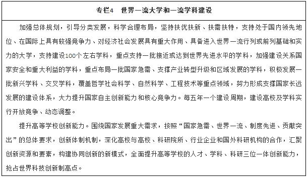 以中国特色、世界一流为核心,以支撑创新驱动发展战略、服务经济社会发展为导向,坚持建设与改革并重,以学科为基础、以绩效为杠杆,统筹高校整体建设和学科建设,鼓励和支持不同类型的高水平大学和学科差别化发展,支持拥有多个国内领先、国际前沿高水平学科的大学,全面建设进入世界一流大学行列或前列;支持拥有若干国内前列、在国际同类院校中居于优势地位的高水平学科的大学,通过学科建设带动学校进入世界同类大学前列;支持拥有某一高水平学科的大学,通过建设进入该学科的世界一流行列或前列。支持省级政府根据国家建设布局,结合经济社会发展需求和基础条件,自主推动区域内高等学校建设高水平大学和优势学科,积极探索不同类型、不同层次高等学校的一流建设之路。