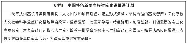 完善高校哲学社会科学体系。坚持马克思主义指导地位,实施以育人育才为中心的高校哲学社会科学整体发展战略,把中国特色社会主义理论体系贯穿研究和教学全过程,构筑学生、学术、学科一体的综合发展体系,建立科学权威、公开透明的哲学社会科学成果评价体系,努力形成中国特色、中国风格、中国气派的学科体系、学术体系、话语体系。积极参与马克思主义理论研究和建设工程,通过开展合作研究等方式积极参与哲学社会科学创新工程,深入实施高校哲学社会科学繁荣计划。坚持以人民为中心的研究导向,加强对党中央治国理政新理念新思想新战略的研究阐释,深入开展重大现实问题、重大理论问题、重大实践经验总结研究。积极参与实施国家哲学社会科学人才工程,加大相关人才计划对哲学社会科学人才的支持力度。完善高校哲学社会科学研究创新平台体系,加强高校马克思主义学院建设,重点建好一批高校人文社会科学重点研究基地、专题数据库和文科实验室。推进中国特色新型高校智库建设。加强国别和区域重点研究基地建设。支持高校建立海外中国学术研究中心,参与和设立国际性学术组织,建设一批优秀外文学术网站和学术期刊。