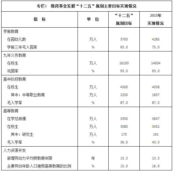 总体来看,《教育规划纲要》确定的阶段性目标如期实现,教育事业发展“十二五”规划圆满收官,我国教育进入提高质量、优化结构、促进公平的新阶段。