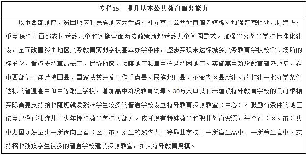 办好特殊教育。继续实施好特殊教育提升计划,完善特殊教育学校布局。完善随班就读支持保障政策体系,重点支持贫困地区和农村地区普通中小学开展随班就读,推行融合教育。以区县为单位,精准施策,全面普及残疾儿童少年义务教育。推动特殊教育学校和残疾儿童康复机构积极创造条件,开展残疾儿童学前教育。加快发展以职业教育为主的残疾人高中阶段教育。为家庭经济困难的残疾儿童和残疾青少年提供包括义务教育、高中阶段教育在内的12年免费教育。完善高等学校和职业学校招收残疾学生政策。逐步健全特殊教育课程教材体系、学校基本办学标准。实行轻中度残疾学生随班就读,中重度残疾学生在特教学校就读,为极重度残疾学生送教上门。促进教育与康复相结合,注重残疾学生潜能开发和缺陷补偿,强化职业素养和职业技能培养,加强残疾学生专业学习、就业等方面支持保障服务,促进残疾学生更好融入社会。
