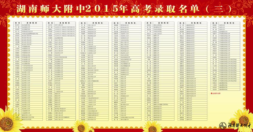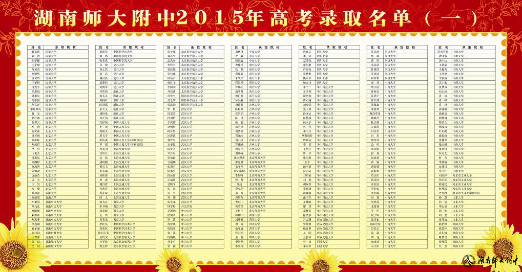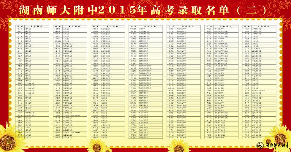 课程建设 教学资讯 课堂教学 学科竞赛 作业公示 校本课程 高考专栏 2015年高考录取名单 发布:教学与课程处 来源:未知 日期:2015-11-20 人气:分享到: 上一篇:2015年国外名校录取名单 下一篇:东南大学给我校发来喜报和感谢信 通知公告 更多 湖南师范大学附属中学2025年第二 湖南师范大学附属中学2025年教师 关于开展“科研优秀奖”评选活动 湖南师大附中2025-2026学年度第一学 湖南师范大学附属中学2025级新生 湖南师范大学附属中学大泽湖校区 最新动态 更多