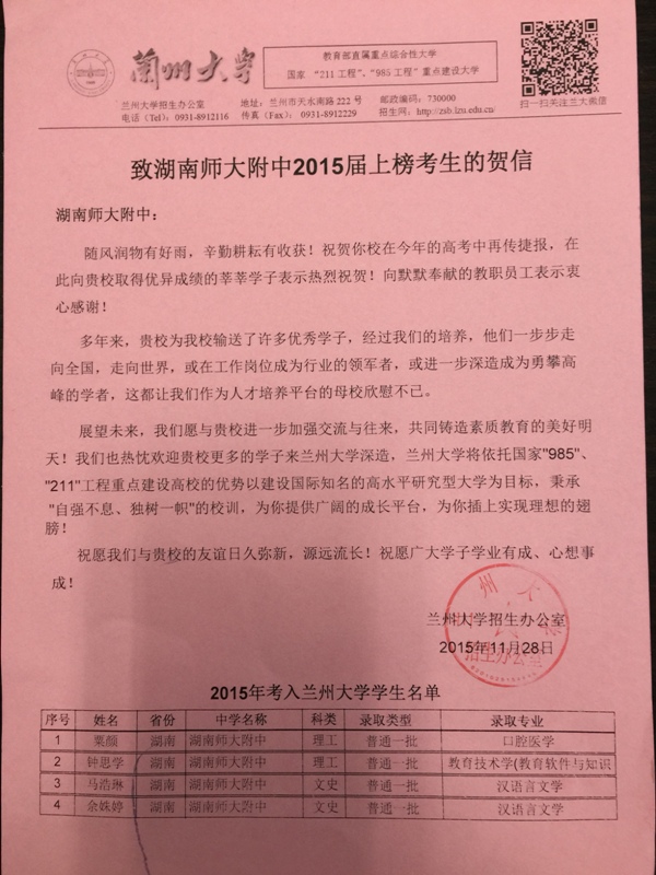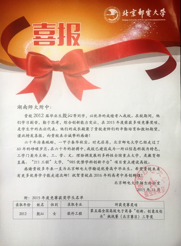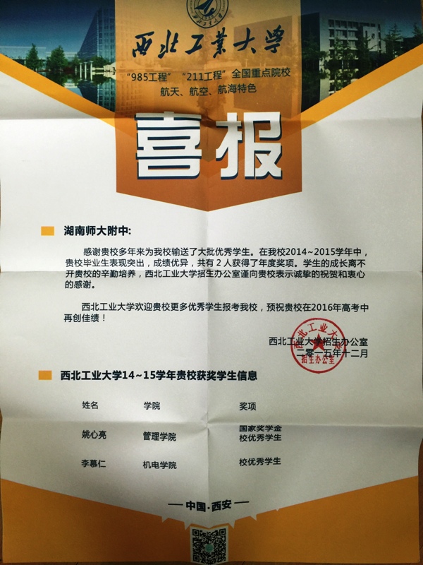 课程建设 教学资讯 课堂教学 学科竞赛 作业公示 校本课程 高考专栏 西北工业大学、北京邮电大学、兰州大学发来喜报 发布:教学与课程处 来源:未知 日期:2016-01-25 人气:分享到: 近日,西北工业大学、北京邮电大学、兰州大学先后发来喜报,祝贺我校优秀学子在高校取得的优异成绩,感谢我校的辛勤培育。 上一篇:东南大学给我校发来喜报和感谢信 下一篇:中国人民大学、同济大学、华中科技大学、天津大学、中国药科大学发来喜报 通知公告 更多 湖南师范大学附属中学2025年第二 湖南师范大学附属中学2025年教师 关于开展“科研优秀奖”评选活动 湖南师大附中2025-2026学年度第一学 湖南师范大学附属中学2025级新生 湖南师范大学附属中学大泽湖校区 最新动态 更多