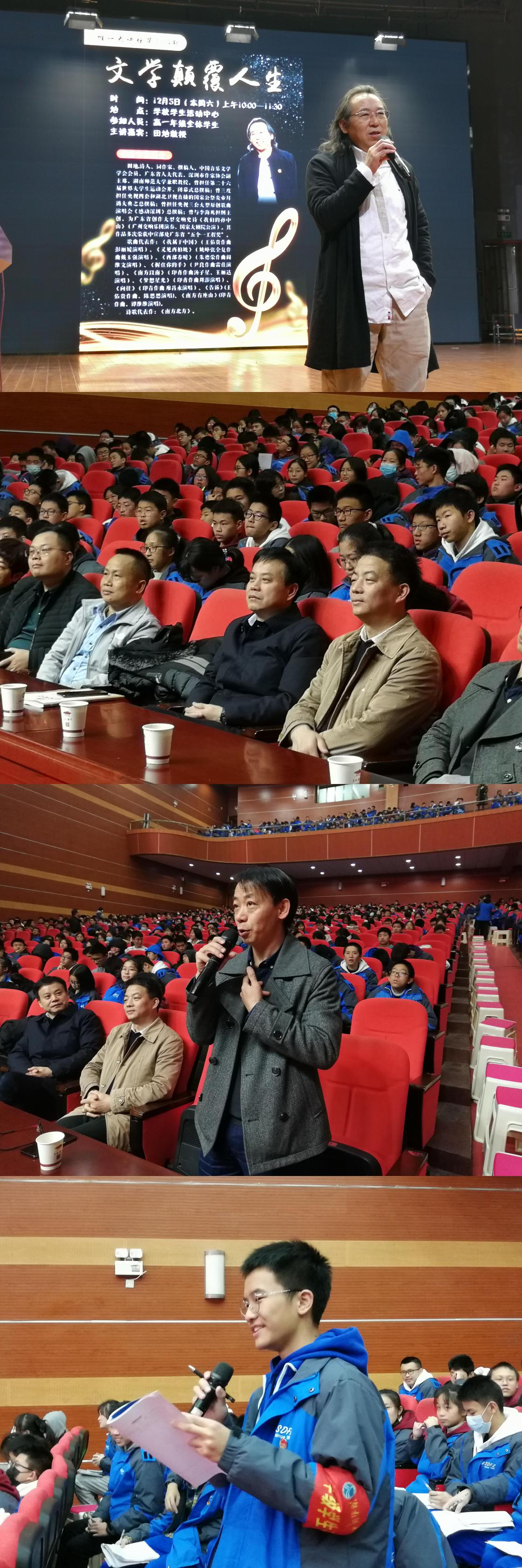 课程建设 教学资讯 课堂教学 学科竞赛 作业公示 校本课程 高考专栏 著名词作家田地先生应邀来我校讲座 发布:课程与教学处 来源:课程与教学处 日期:2020-12-09 人气:分享到: 12月5日上午,我校惟一大讲坛第124期在学生活动中心开讲,著名诗人、词作家、广东省人大代表、深圳市作家协会副主席、我校知名校友田地老师给高一年级全体学生带来题为“文学颠覆人生”讲座。谢永红校长、苏建祥副校长及高一年级部分老师一同聆听讲座,课程与教学处副主任朱修龙担任讲座主持。 讲座上,田地老师结合人生经历,畅谈自己的文学追梦路。他从自己读书的经历讲起,分享了自己的童年、故乡、求学、创作的故事。他告诉大家,写作最重要的是真诚,文学创作者绝不作廉价的讴歌,在物欲横流的时代,应懂得如何守住初心,并且只有坚持写作,才能在文学创作中展示自己的个性。他表示,兴趣是最好的老师,顺着兴趣往前走,一定会有一片新天地。在场的师生仔细聆听,认真思考。每当田地老师讲到精彩处时,大家由衷地掌声不断,喝彩连连。 在讲座最后的问答互动环节上,在场的老师和同学们纷纷与田地老师交流心得,并提出“诗歌鉴赏”、“创作动力”等相关的疑惑,田地老师就大家提出的问题解答,给出了一个个充满人生智慧的答案。最后,他深情朗诵了自己的诗歌代表作《南方北方》,迎来大家阵阵喝彩,直到讲座结束,同学们都还意犹未尽。 这次讲座既拓宽了同学们的眼界,也在同学们心中埋下了文学之梦的种子。 (撰稿:熊健 审稿:朱修龙) 上一篇:同济大学雷星晖副校长一行来校访问 下一篇:湖南省长沙市一中国际部刘静主任一行到我校交流访问 通知公告 更多 湖南师范大学附属中学2025年第二 湖南师范大学附属中学2025年教师 关于开展“科研优秀奖”评选活动 湖南师大附中2025-2026学年度第一学 湖南师范大学附属中学2025级新生 湖南师范大学附属中学大泽湖校区 最新动态 更多