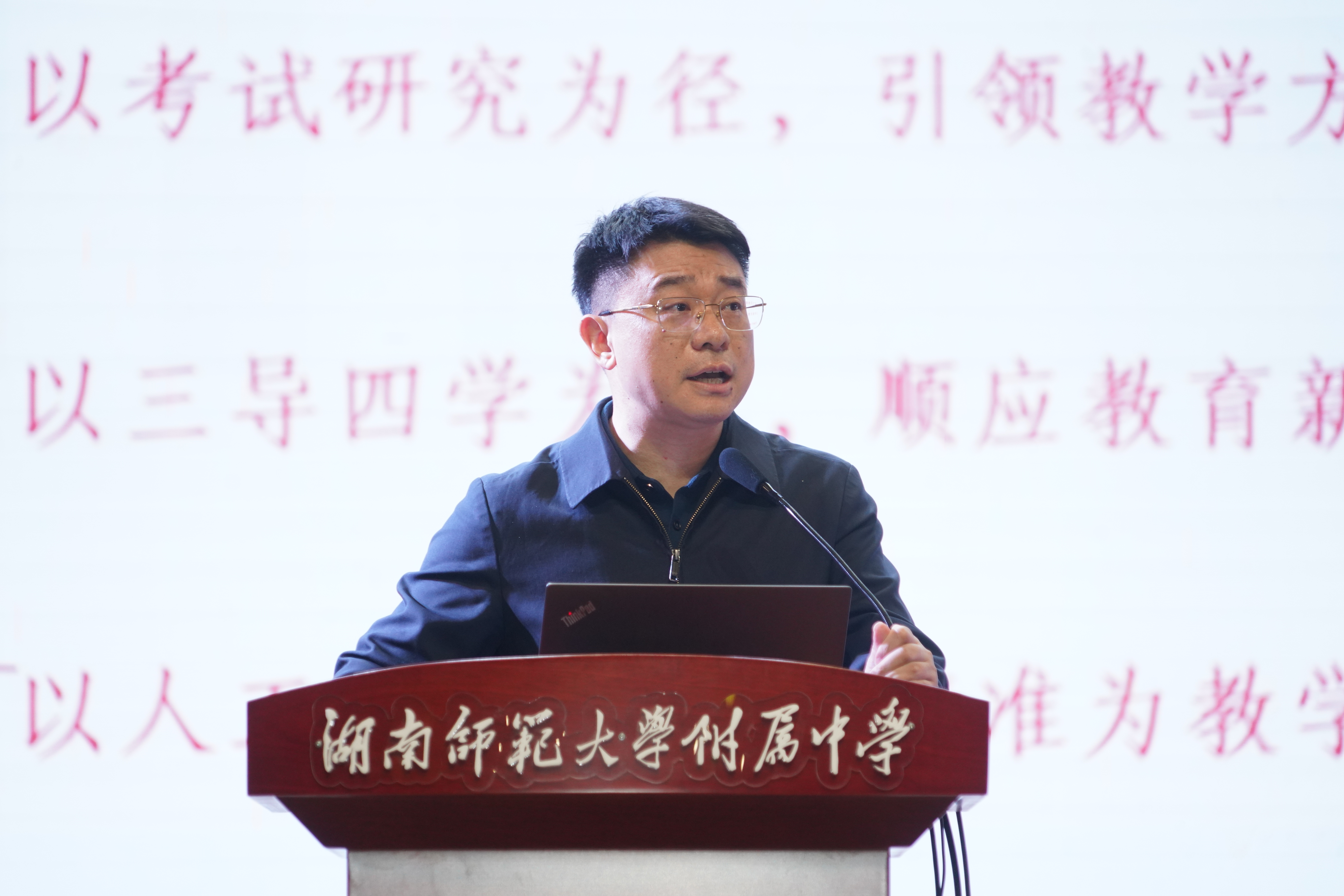 课程与教学处主任陈淼君围绕教学常规管理工作进行了总结。他从常规检查、课堂教学、考试研究、人工智能应用等多个方面入手,强调了教案撰写和教学后记对于提升教学质量的重要性,针对试卷讲评课提出了切实可行的改进建议,探讨了人工智能为教学工作创新提供新思路。