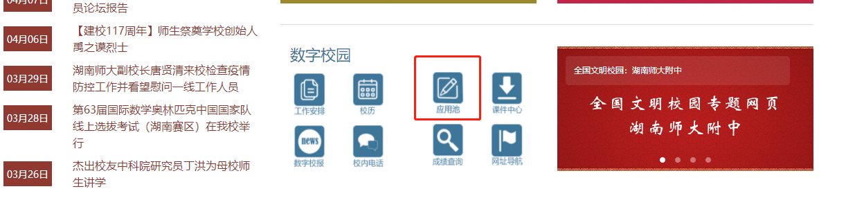数字校园 数字校园 校内电话 学校校历 学生信息化应用指南 教师信息化应用指南 友情链接 帮助中心 应用池 发布:系统管理员 来源:未知 日期:2022-05-16 人气:分享到: 1. 在浏览器中输入//m.wcgj666.com,进入湖南师大附中官方网站(建议使用谷歌浏览器); 2. 在官方网站中点击应用池; 3. 应用池汇总了学校现有的管理、资源、教研相关的所有应用,各应用的地址、操作说明均罗列其中。 上一篇:课件中心使用操作 下一篇:人人通使用指南 通知公告 更多 2025年劳动节放假通知 关于做好政工专业知识考试工作的 2026年多伦多大学士嘉堡校区绿色 2025年清明节放假通知 湖南师范大学附属中学2025年公开 湖南省教育厅关于做好湖南省教育 最新动态 更多