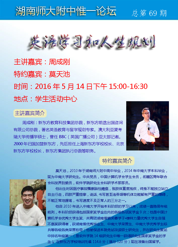 新闻中心 附中新闻 通知公告 最新动态 教育视点 集团学校新闻联播 媒体附中 工作安排 微信附中 惟一论坛第69期:英语学习和人生规划 发布:教学与课程处 来源:未知 日期:2016-05-12 人气:分享到: 上一篇:关于公布2016年公开招聘成绩及入围体检人员名单的通知 下一篇:关于开展二级网站评比工作的通知 通知公告 更多 关于征集湖南师大附中“十五五” 湖南师大附中2026年教师招聘(第 湖南师大附中2025年教育教学成果 湖南师范大学附属中学2025年零星 关于举办第40届校园文化艺术节的 湖南师范大学附属中学2026年教师 最新动态 更多