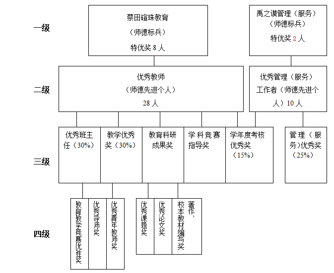优秀班主任、教学优秀奖、学科竞赛指导奖、教育科研成果奖(著作.校本教材编写奖、优秀课题奖、优秀论文奖)、教育教学竞赛优胜奖
