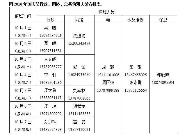 ⑴行政值班、网络值班、水电值班在各自办公室(行政值班记录本放在执中楼一楼值班室);