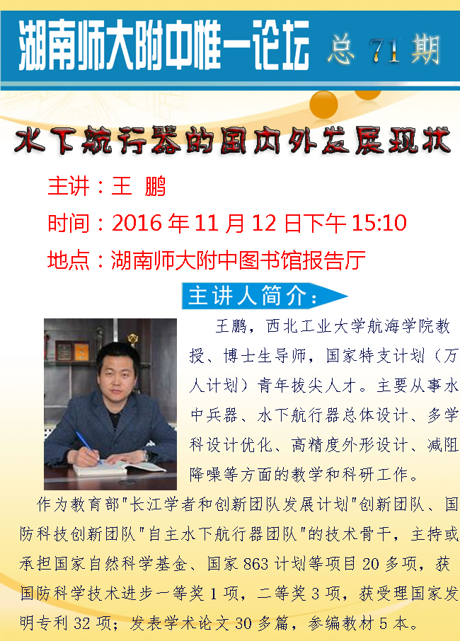 新闻中心 附中新闻 通知公告 最新动态 教育视点 集团学校新闻联播 媒体附中 工作安排 微信附中 惟一论坛第71期:水下航行器的国内外发展现状 发布:教学与课程处 来源:未知 日期:2016-11-08 人气:分享到: 上一篇:湖南师大附中关于做好正高级教师职称申报推荐工作的通知 下一篇: 惟一论坛第72期:生态危机与中国的生态治理战略 通知公告 更多 关于开展“科研优秀奖”评选活动 湖南师大附中2025-2026学年度第一学 湖南师范大学附属中学2025级新生 湖南师范大学附属中学大泽湖校区 2025年湖南省基础教育教学成果奖 湖南省教育厅关于开展2025年湖南 最新动态 更多