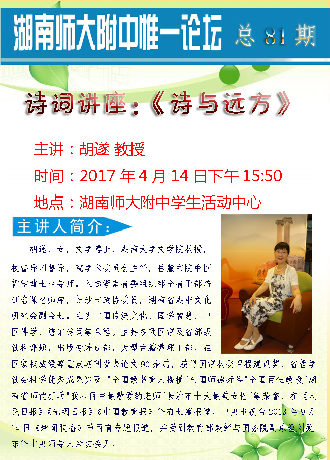 新闻中心 附中新闻 通知公告 最新动态 教育视点 集团学校新闻联播 媒体附中 工作安排 微信附中 惟一论坛第81期:《诗与远方》 发布:教学与课程处 来源:未知 日期:2017-04-10 人气:分享到: 上一篇:关于2016年度学分登记的通知 下一篇:惟一论坛第82期:做优秀高三父母,与孩子高考同行 通知公告 更多 湖南师大附中2025-2026学年度第一学 湖南师范大学附属中学2025级新生 湖南师范大学附属中学大泽湖校区 2025年湖南省基础教育教学成果奖 湖南省教育厅关于开展2025年湖南 湖南师范大学附属中学2025级新生 最新动态 更多