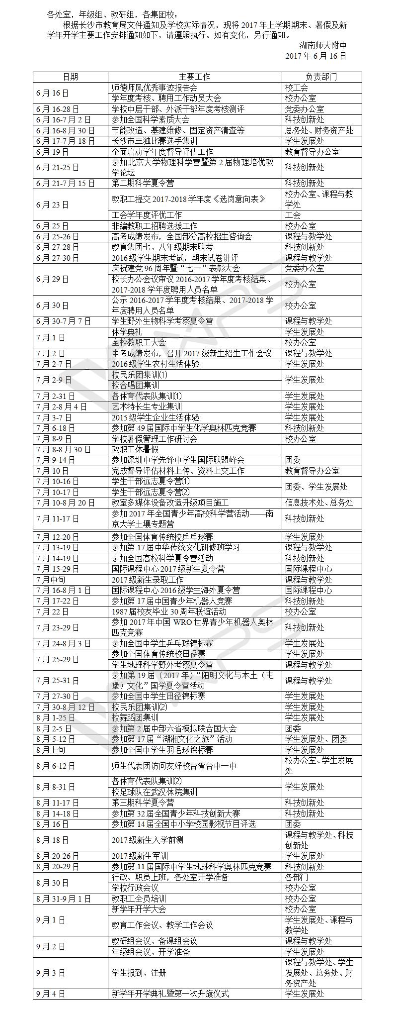 2017年上学期期末、暑假及新学年开学主要工作安排
