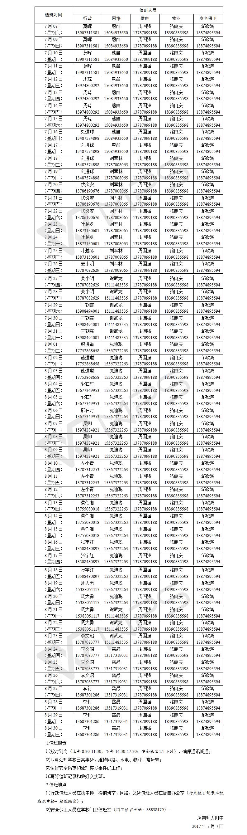 新闻中心 附中新闻 通知公告 最新动态 教育视点 集团学校新闻联播 媒体附中 工作安排 微信附中 湖南师大附中2017年暑假行政、网络、总务及安全保卫值班安排 发布:系统管理员 来源:未知 日期:2017-07-20 人气:分享到: 上一篇:关于召开全校教职工大会的通知 下一篇:关于转发湖南省人力资源社会保障厅、湖南省教育厅《关于评选表彰“湖南省优秀教师”“湖南省优秀教育工作者”和第八届 “湖南省徐特立教育奖”获得 通知公告 更多 湖南师大附中2025-2026学年度第一学 湖南师范大学附属中学2025级新生 湖南师范大学附属中学大泽湖校区 2025年湖南省基础教育教学成果奖 湖南省教育厅关于开展2025年湖南 湖南师范大学附属中学2025级新生 最新动态 更多