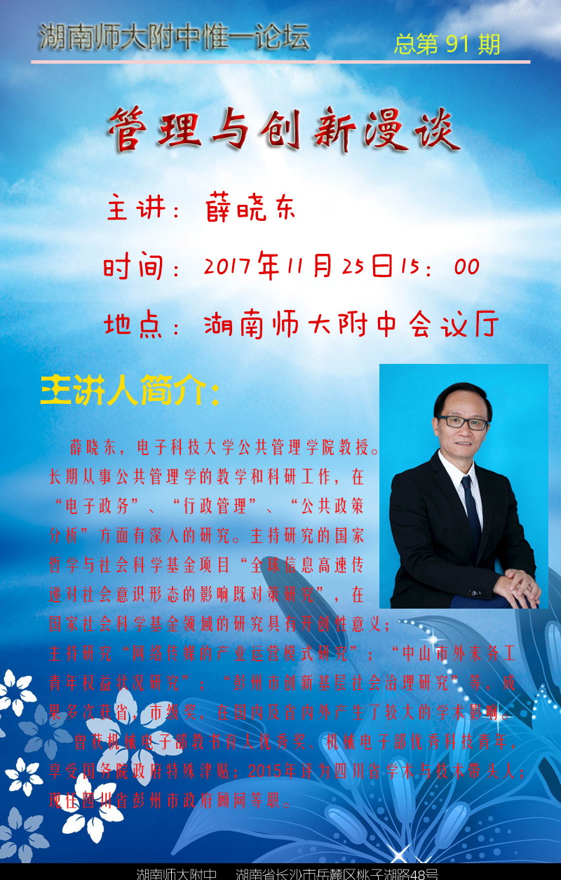 新闻中心 附中新闻 通知公告 最新动态 教育视点 集团学校新闻联播 媒体附中 工作安排 微信附中 惟一论坛第91期:管理与创新漫谈 发布:教学与课程处 来源:未知 日期:2017-11-20 人气:分享到: 上一篇:惟一论坛第90期:4G/5G+3D大数据时代的弄潮儿 下一篇:湖南师大附中教育集团第三届第一次青年教师教学竞赛活动方案 通知公告 更多 湖南师大附中2025-2026学年度第一学 湖南师范大学附属中学2025级新生 湖南师范大学附属中学大泽湖校区 2025年湖南省基础教育教学成果奖 湖南省教育厅关于开展2025年湖南 湖南师范大学附属中学2025级新生 最新动态 更多