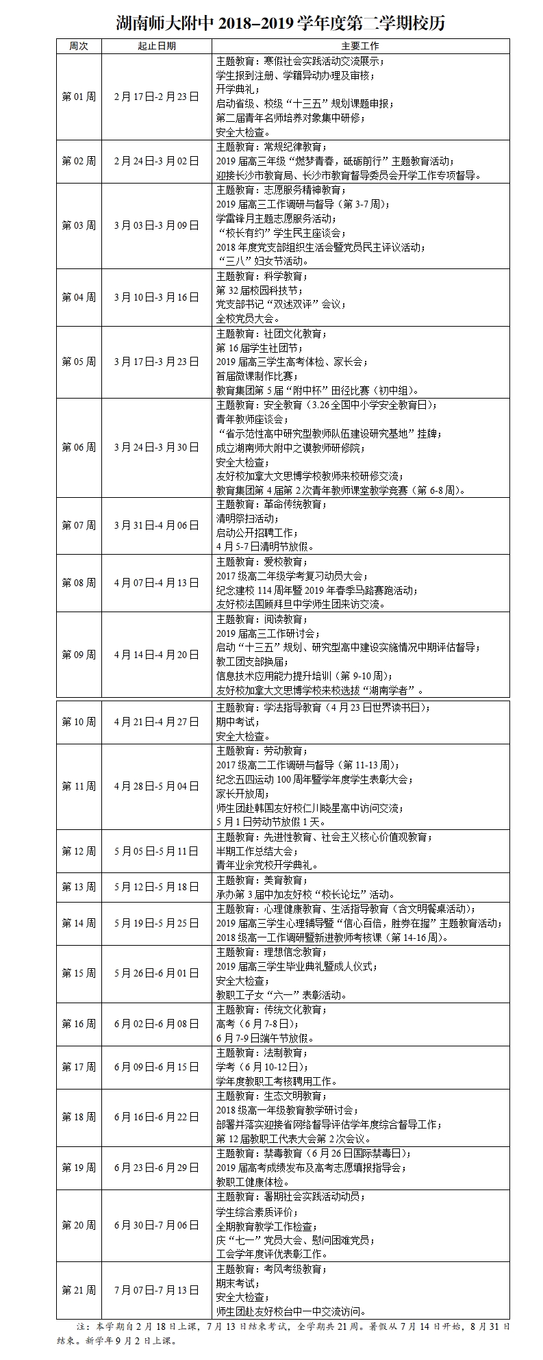 新闻中心 附中新闻 通知公告 最新动态 教育视点 集团学校新闻联播 媒体附中 工作安排 微信附中 关于印发2018-2019学年度第二学期校历的通知 发布:系统管理员 来源:未知 日期:2019-02-28 人气:分享到: 各处室,年级组、教研组,各集团校: 《湖南师大附中 2018-2019 学年度第二学期校历》经 2019 年第 4 次校长办公会审议通过,现予以公布(见附件),请按照校历统筹安排并推进本学期的各项工作。 湖南师范大学附属中学 2019 年 2 月 25 日 上一篇:2019年度协会课题申报通知 下一篇:2019年妇女节放假通知 通知公告 更多 关于征集湖南师大附中“十五五” 湖南师大附中2026年教师招聘(第 湖南师大附中2025年教育教学成果 湖南师范大学附属中学2025年零星 关于举办第40届校园文化艺术节的 湖南师范大学附属中学2026年教师 最新动态 更多