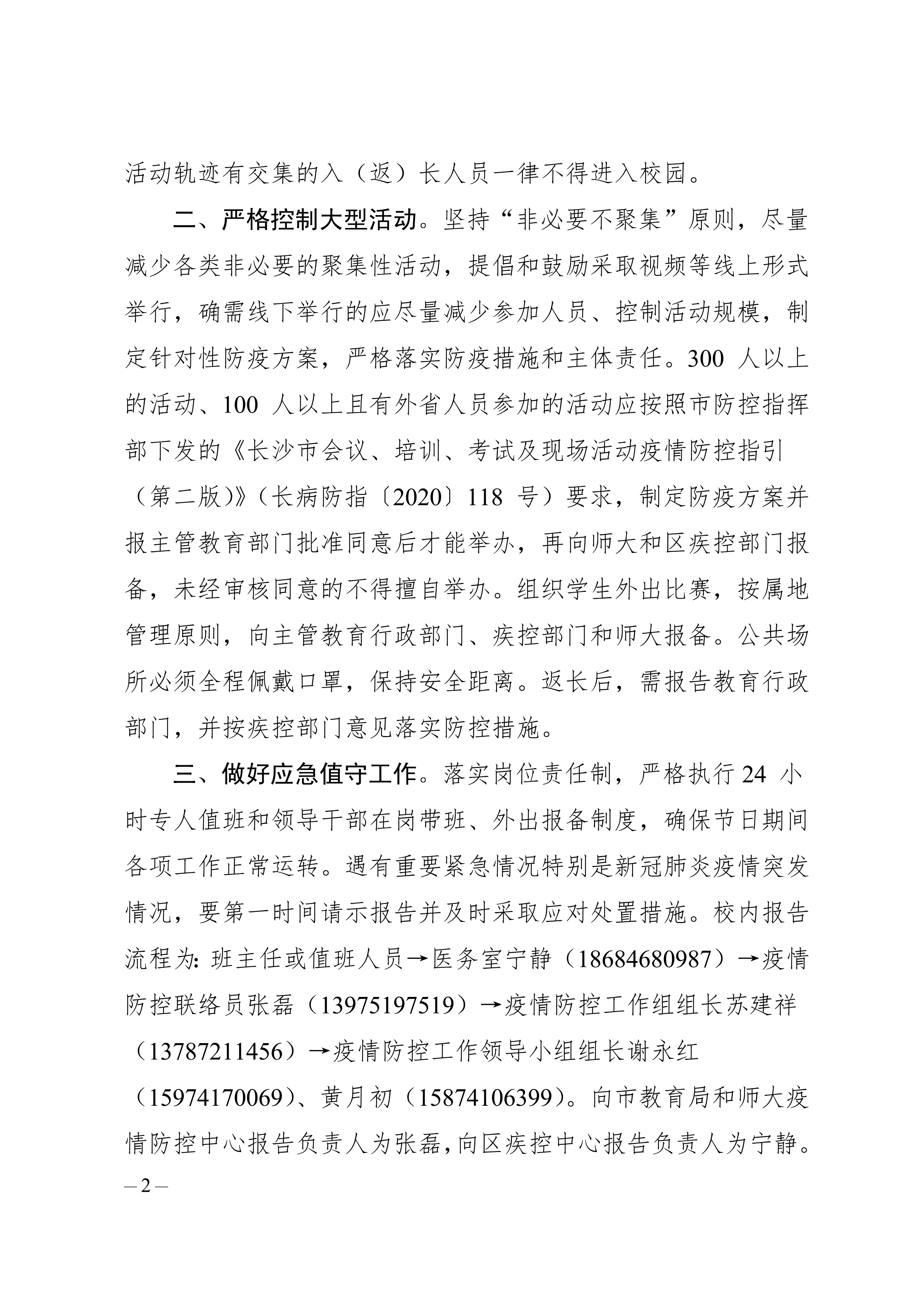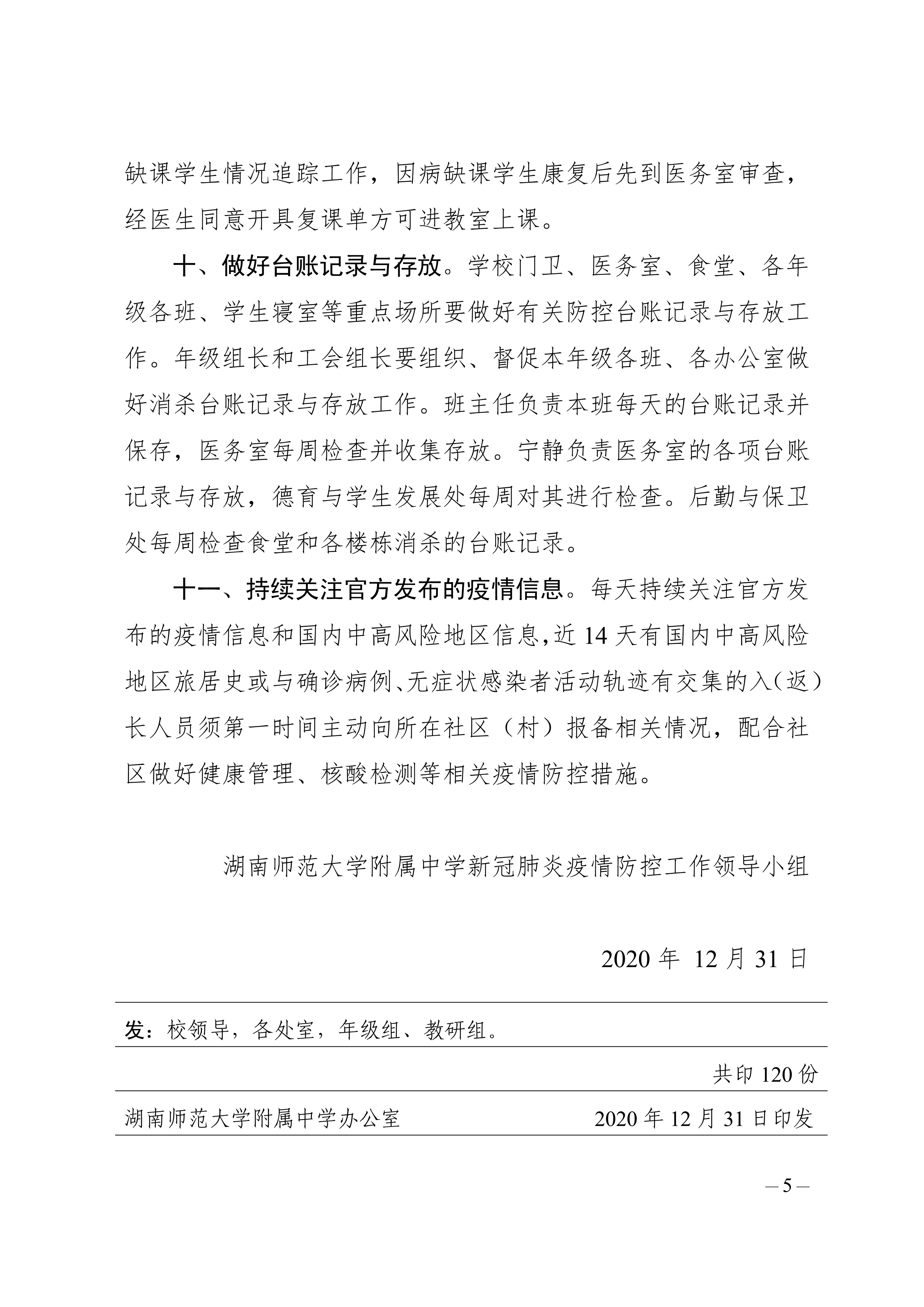 新闻中心 附中新闻 通知公告 最新动态 教育视点 集团学校新闻联播 媒体附中 工作安排 微信附中 校行发〔2020〕43号湖南师范大学附属中学关于做好2021年元旦至春节期间疫情防控工作的通知 发布:系统管理员 来源:未知 日期:2021-01-01 人气:分享到: 上一篇:湖南师大附中广益楼加固工程项目招标公告 下一篇:湖南师范大学附属中学2020年下学期期末、寒假及新学期开学主要工作安排 通知公告 更多 湖南师范大学附属中学2025年第二 湖南师范大学附属中学2025年教师 关于开展“科研优秀奖”评选活动 湖南师大附中2025-2026学年度第一学 湖南师范大学附属中学2025级新生 湖南师范大学附属中学大泽湖校区 最新动态 更多