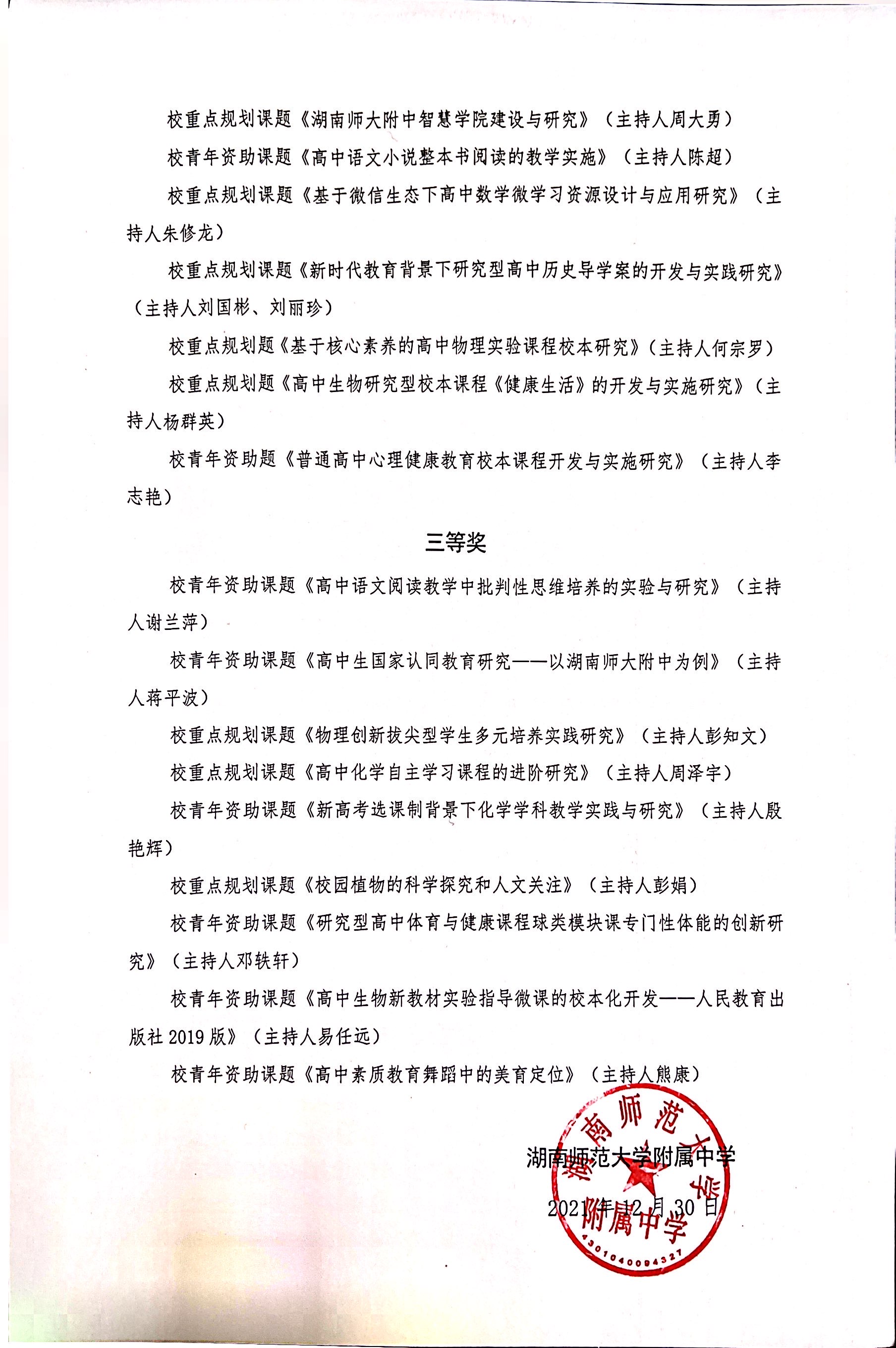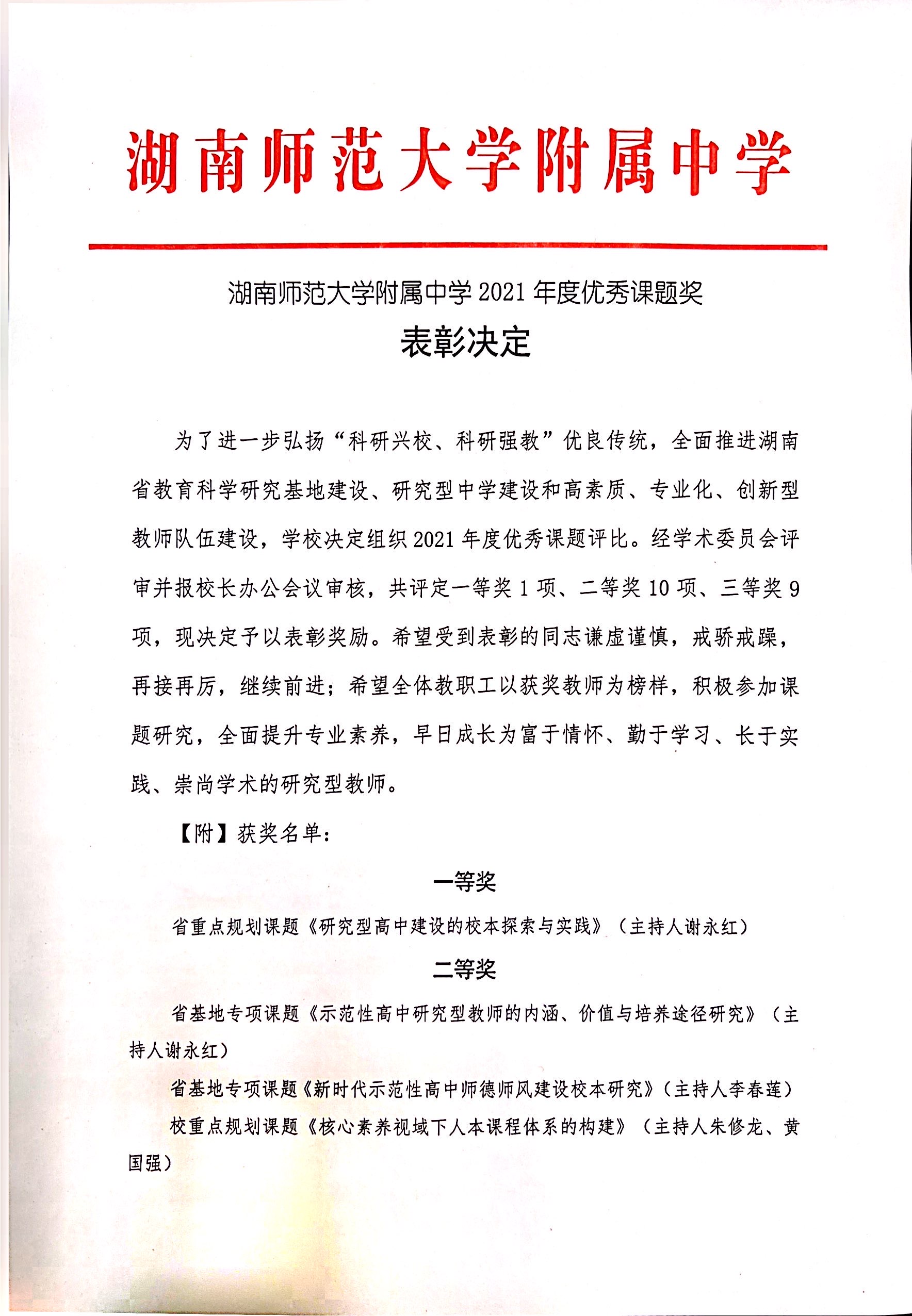新闻中心 附中新闻 通知公告 最新动态 教育视点 集团学校新闻联播 媒体附中 工作安排 微信附中 湖南师范大学附属中学2021年度优秀课题奖表彰决定 发布:系统管理员 来源:未知 日期:2021-12-30 人气:分享到: 上一篇:关于开展2022年寒假教科研论文评比活动的通知 下一篇:湖南师范大学附属中学2021年下学期期末、寒假及新学期开学主要工作安排 通知公告 更多 湖南师范大学附属中学2025年第二 湖南师范大学附属中学2025年教师 关于开展“科研优秀奖”评选活动 湖南师大附中2025-2026学年度第一学 湖南师范大学附属中学2025级新生 湖南师范大学附属中学大泽湖校区 最新动态 更多