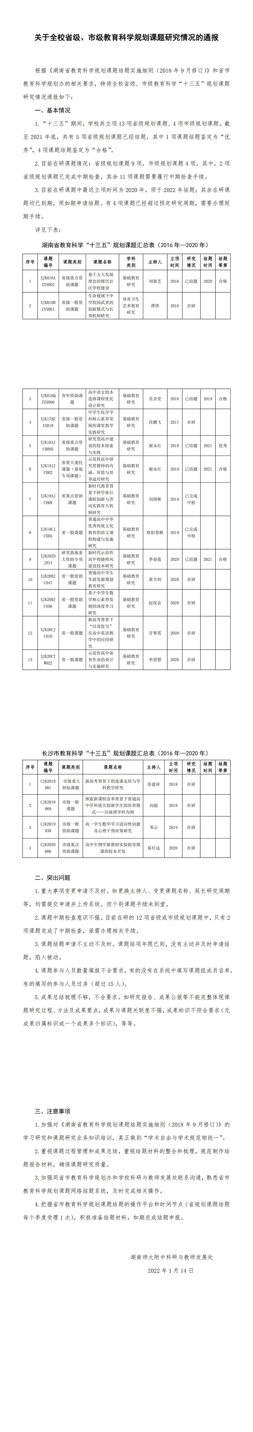 新闻中心 附中新闻 通知公告 最新动态 教育视点 集团学校新闻联播 媒体附中 工作安排 微信附中 关于全校省级、市级教育科学规划课题研究情况的通报 发布:系统管理员 来源:未知 日期:2022-01-14 人气:分享到: 上一篇:关于开展第五届湖南省基础教育教学成果奖评审工作的通知 下一篇:湖南师大附中化妆间、接待室维修改造工程项目成交公告 通知公告 更多 湖南师范大学附属中学2025年第二 湖南师范大学附属中学2025年教师 关于开展“科研优秀奖”评选活动 湖南师大附中2025-2026学年度第一学 湖南师范大学附属中学2025级新生 湖南师范大学附属中学大泽湖校区 最新动态 更多
