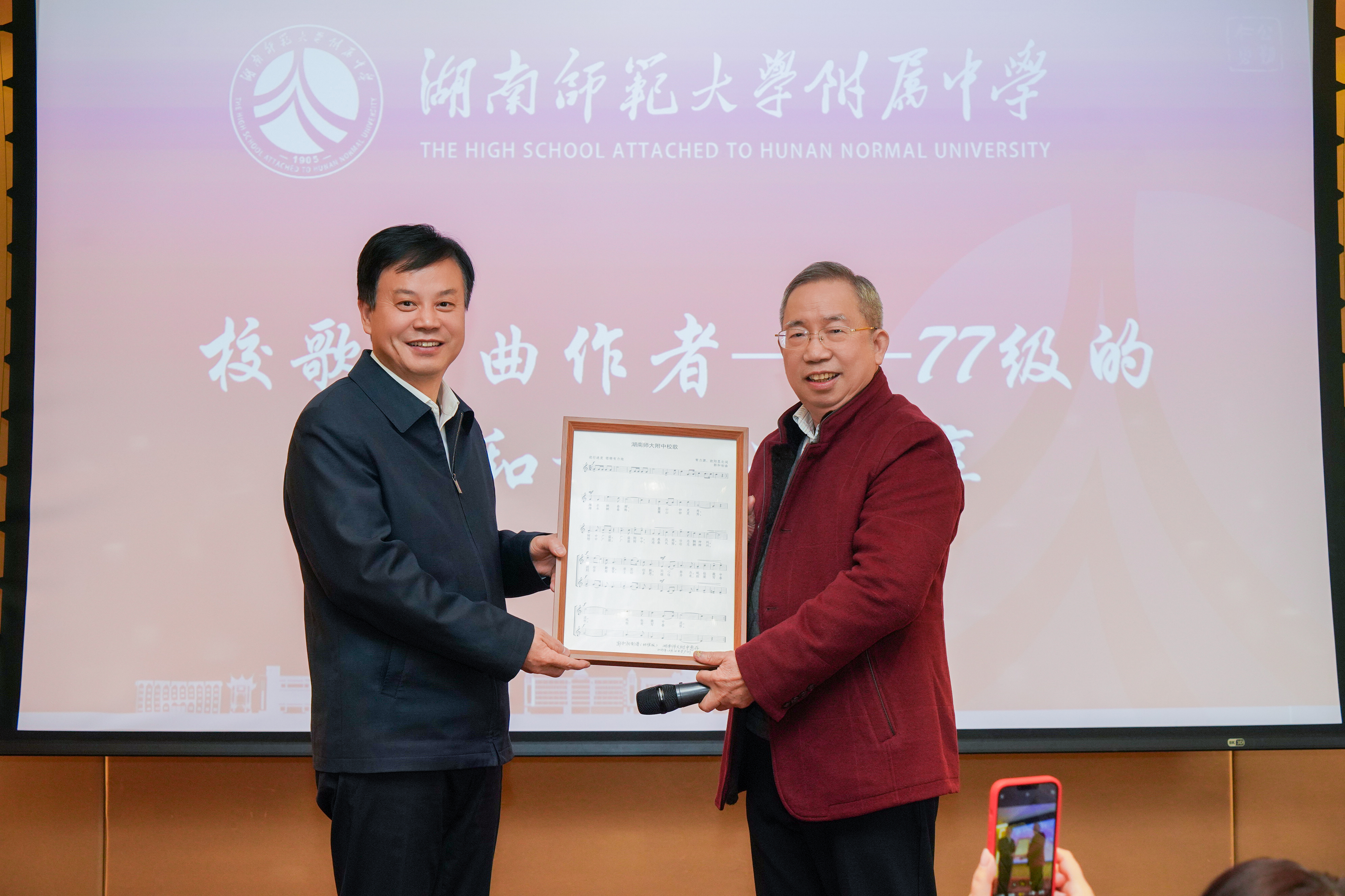此次校友年会邀请了母校校歌的曲作者郭和初教授,郭老师曾就读湖南师范学院音乐系作曲专业,毕业后留校任教。上个世纪90年代初先后为湖南师大校歌和湖南师大附中校歌谱曲。90年代后期调往华南师范大学,曾担任华南师范大学音乐学院副院长、硕士生导师,其音乐作品曾获得国家音乐创作最高奖“金钟奖”“文华奖”,获得广东省“优秀音乐家突出贡献奖”等奖项。郭和初教授的夫人为附中校友。郭教授登台演讲,他激情满怀地追忆起校歌创作的经历,讲解校歌曲调和旋律的特点,他对这首由常力源校长、欧阳昱北老师写的校歌歌词谱的曲子是满意的,郭教授表示了能用音乐形式为附中精神凝聚而感到自豪,也为对校歌谱曲30多年后能有机会与附中领导和校友们相聚表示惊讶和赞叹,对刘会长邀请他参加此次广州校友会年会表达谢意;郭教授向母校赠送了装裱的校歌曲谱,并表示如有需要还会继续为附中文艺繁荣作出自己的贡献。