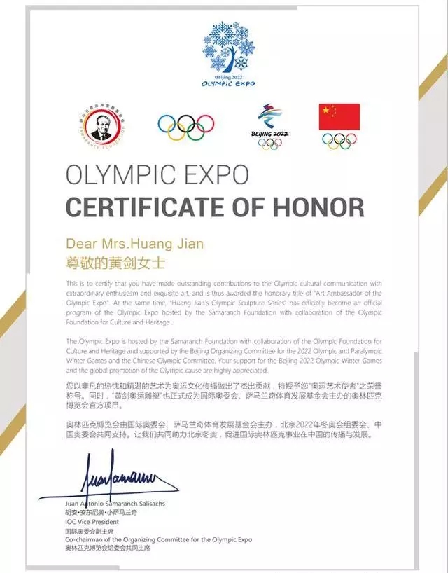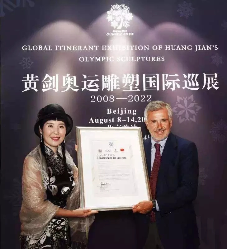 她是全球首位被国际奥委会授予“奥运艺术使者”称号的艺术家,也是全球唯一连续五届为奥运会创作永久性大型雕塑的艺术家:2008年北京奥运会大型群雕《明皇贵妃马球图》、2012年伦敦奥运会大型群雕《中英马球友谊赛》、2016年里约奥运会大型雕塑《中巴足球友谊赛》、2020年东京奥运会动态雕塑《中日柔道友谊赛》、2022年北京冬奥会动态雕塑《冬奥之约》和《冬奥之梦》。黄剑致力于用艺术、用雕刻的手法表达友好、传播友谊。她认为奥运精神在于追求更高、更快、更强,具有开放性和全球性。