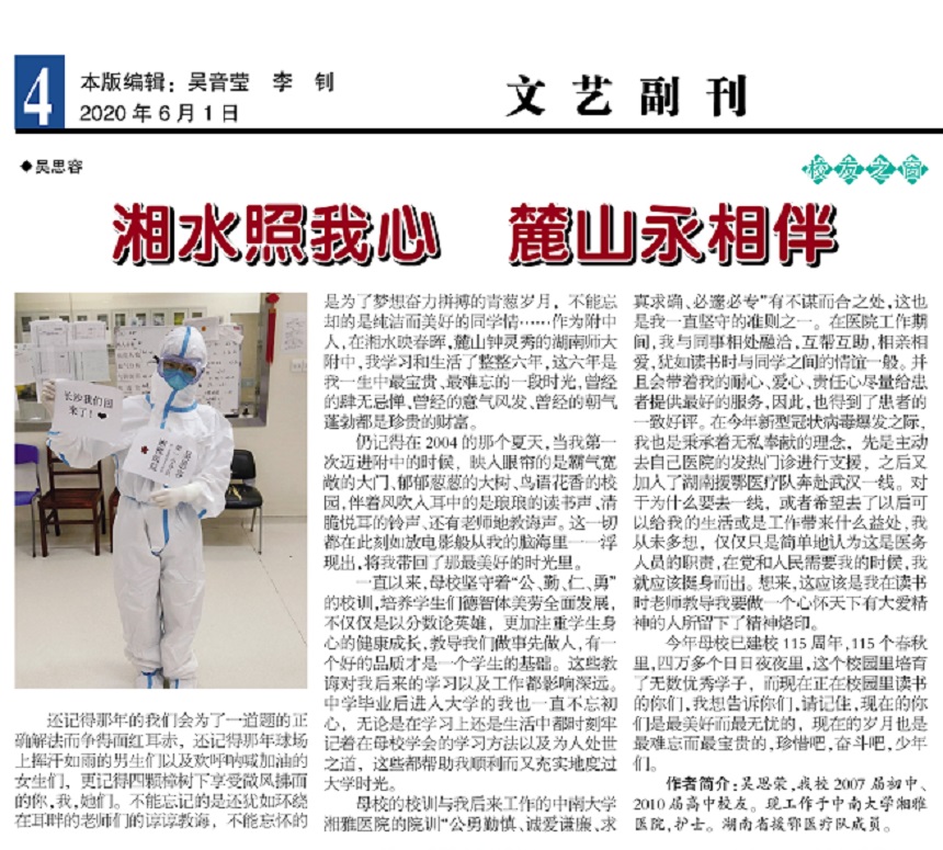 人物 人物访谈 名师风范 校友风采 湘水照我心 麓山永相伴 发布:焦畅 来源:校友会 日期:2020-06-24 人气:分享到: 上一篇:一个关于暖宝宝的故事 下一篇:【附中追梦人】我校杰出校友向一莎教授获美国国家科学基金会奖 通知公告 更多 2024年端午节放假通知 湖南师范大学附属中学2024年寒假 关于湖南师范大学开展“师大好网 湖南师大附中2024年端午节教职工 湖南师大附中2023-2024学年度考核工 湖南师大附中2024年公开招聘专任 最新动态 更多