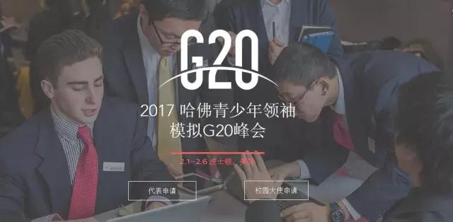 伴随着2016年二十国集团杭州峰会的胜利闭幕,2017年第二届“国际青少年领袖模拟G20峰会”计划在全中国范围内邀请二十所最具代表性的重点中学,于2017年1月31日至2月8日派出学生代表赴美国马萨诸塞州剑桥市,与美国本地优秀高中生一同经过抽签分成二十支代表团,模拟G20峰会各与会国家的政府官员及外交代表,围绕“可持续发展”、“全球安全”和“经济发展”三个主题下的多个子议题进行交流和讨论,力求达成共赢决议。参会学生将有机会充分了解自己所代表国家的文化及政治立场,深入发挥自己所扮演角色的主观能动性,在争取本国利益的同时,兼顾全球发展,模拟全球重要经济体之间的对话。