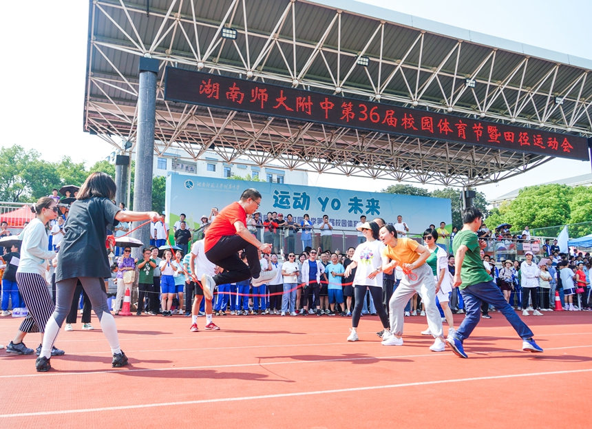 八个工会组教职工代表队分甲乙两组参加了绳舞飞扬、足球射门、迎面接力三个项目的角逐,全校师生共同见证了这一盛大的趣味运动会。老师们的比赛带动了全体学生的运动激情,教职工趣味运动会将校田径运动会的热烈气氛推向了高潮。
