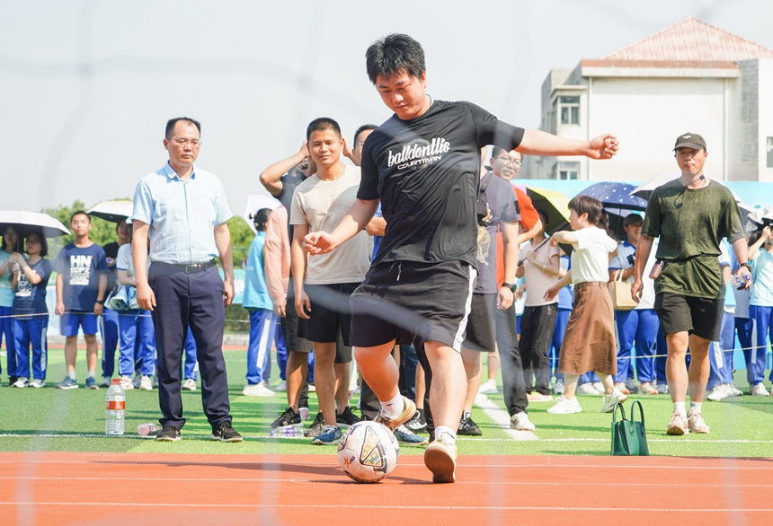 足球射门比赛,在定球、转圈、立定、瞄准、射门和呐喊声中,高二年级工会组代表队、行政三工会组代表队分别获得甲、乙两组第一名。