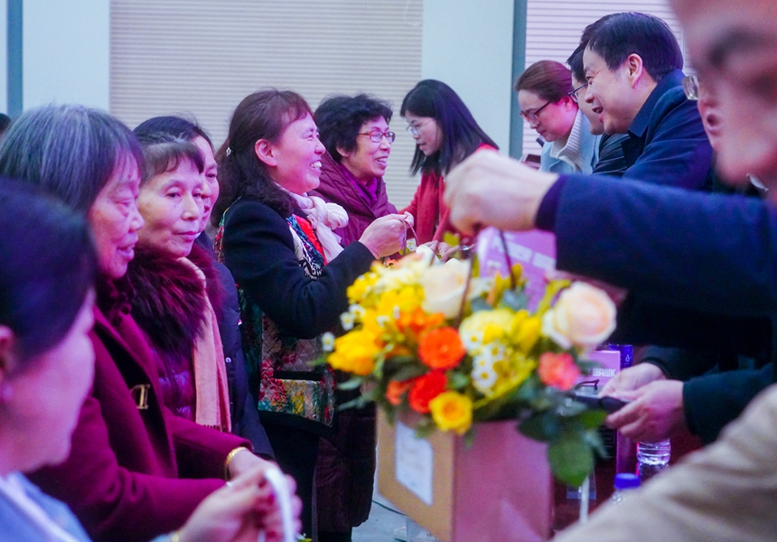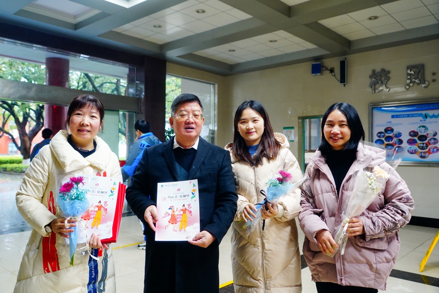 领导们分别向女教职工母亲赠送鲜花和礼物,并合影留念。吴卿老师的母亲陈勤女士,我校退休女教师、王缨老师的母亲邓定亚分别分享了自己的育女心得。