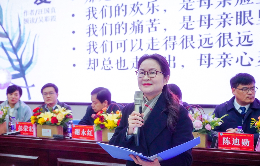 获奖代表杨群英老师和杨茜老师分别发言。语文组获奖教师吴彩霞、刘芳芳、肖莉、谢兰萍等一起表演了“感恩母亲”诗歌朗诵,吴彩霞老师更是带领在座的老师们齐声朗诵《母亲的爱》,全场为之感动,活动气氛带向了高潮。