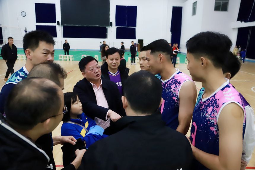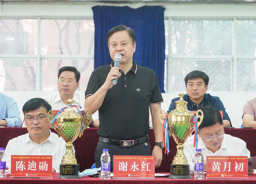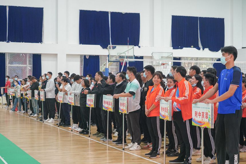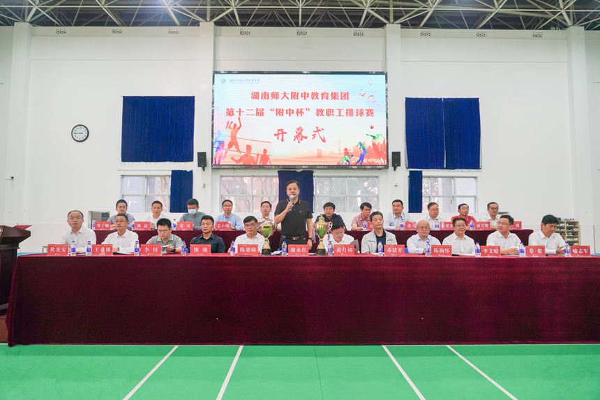 11月12日上午8:30,球赛正式开幕。校长谢永红,党委书记黄月初,副校长兼工会主席陈迪勋,副校长苏建祥,党委委员廖强和陈胸怀,各集团校、友好校校长及裁判长申宝磊等在主席台就座。开幕式由工会副主席伏炎安主持。组委会执行主任、副校长兼工会主席陈迪勋致开幕词。他向为筹备本次赛事付出辛勤劳动的组委会、各集团校工会、教职工运动员们等表示了衷心感谢;肯定大力开展文体活动是我校建设全国文明校园和全国模范之家的要求,排球运动在附中教育集团有着广泛的群众基础和众多的爱好者;向本届运动会提出裁判员要忠于职守、各代表队要识大体顾大局、各运动员要弘扬“自强不息,追求卓越”的附中精神等三点希望;最后他预祝湖南师大附中教育集团第十二届“附中杯”排球赛取得圆满成功。德育与学生发展处主任、本届比赛疫情防控组组长李钊强调了疫情防控要求。上一届冠军代表队将亮闪闪的奖杯移交组委会。随后,运动员代表刘覃老师、裁判员代表陈静分别进行了宣誓。组委会主任谢永红校长激情宣布湖南师大附中教育集团第十二届“附中杯”教职工排球赛开幕!