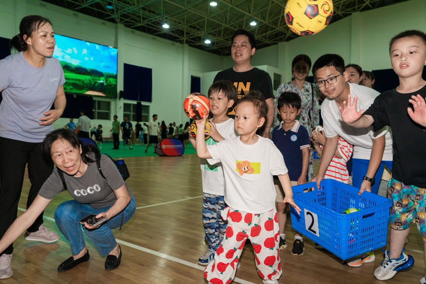 亲子游艺活动在体育馆二楼进行,活动由体育教研组长、关工委成员黄立夫主持。陈迪勋宣布活动正式开始,家长们带着孩子们欢呼雀跃开始了游戏。本次活动共设置了搬物、蒙眼敲锣、掷球、跳绳、射门、两人三足、套圈圈、投篮等八个小游戏。两百多名孩子与他们的家长一同参与,欢呼声、加油声此起彼伏,尤其是兑换奖品环节,丰富多彩的学习用品以及各种漂亮的玩具更是让小朋友们激动不已。