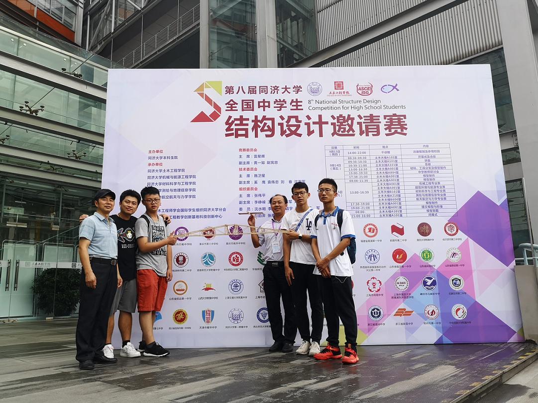 2018年9月13日-9月16日,第八届同济大学全国中学生结构设计邀请赛在上海同济大学土木工程学院举行。我校代表队在领队焦畅老师和杨一鸣、邓放明老师的指导下,带领高三年级刘润杰、王紫涛、陈邑星同学经过暑假和周末期间的精心研究、设计、制作和测试,参加了此次比赛,其作品从全国四十八所特邀重点中学代表队(外加三所学校观摩队)的作品中,取得了第十六名的不错的成绩。成绩的取得,离不开班主任、任课老师和同学们的艰辛努力和付出,希望老师和同学们再接再厉,期待湖南师大附属中学代表队再创辉煌!