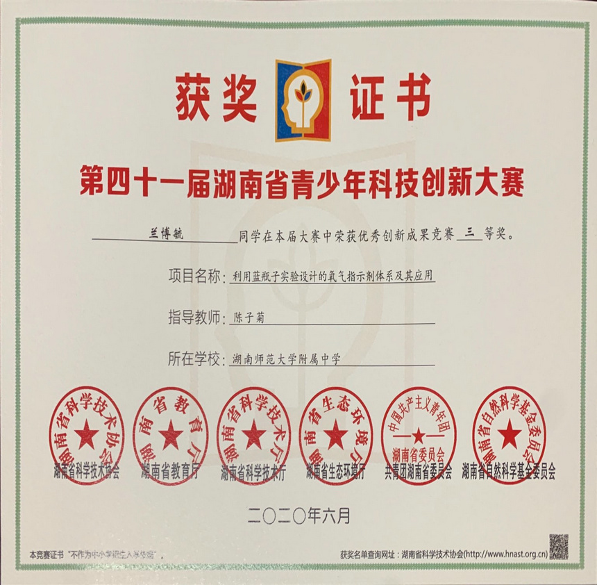 | 利用蓝瓶子实验设计的氧气指示 剂体系及其应用 | 兰博毓 | 陈子菊 | 论文及研究性学习一等奖 |