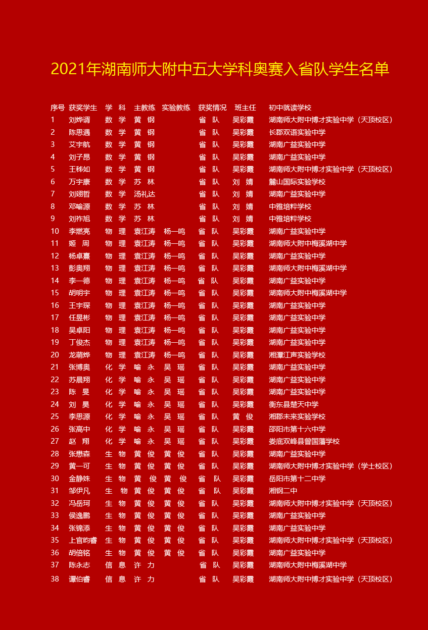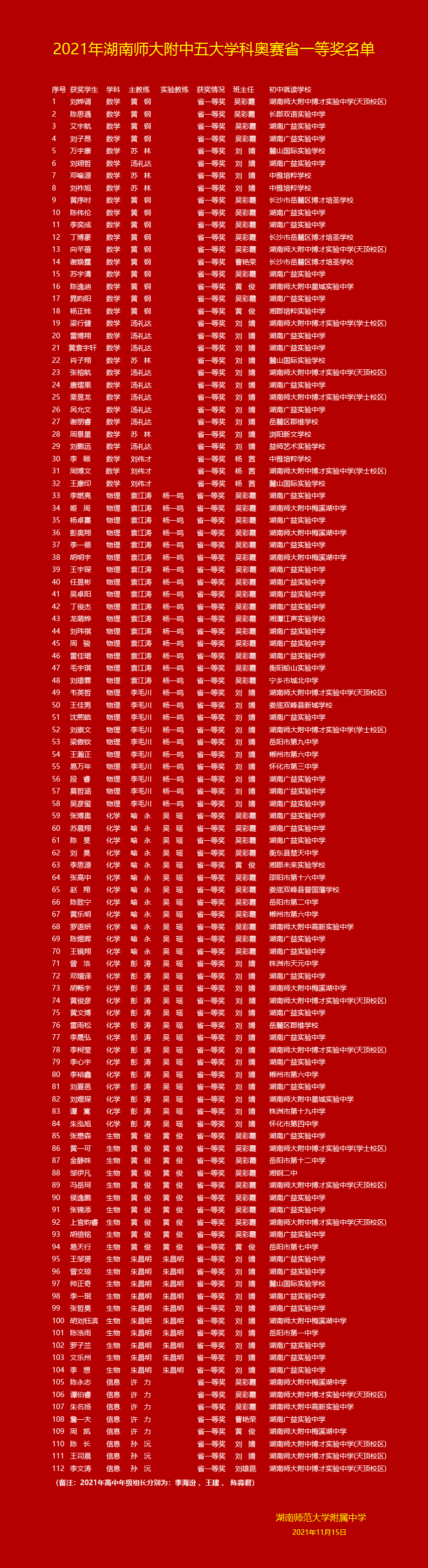 2021年我校中学生五大学科奥赛入湖南省代表队共38人,获省一等奖112人,省队和省一等奖人数遥遥领先,位居全省第一,刷新湖南师大附中奥赛纪录!