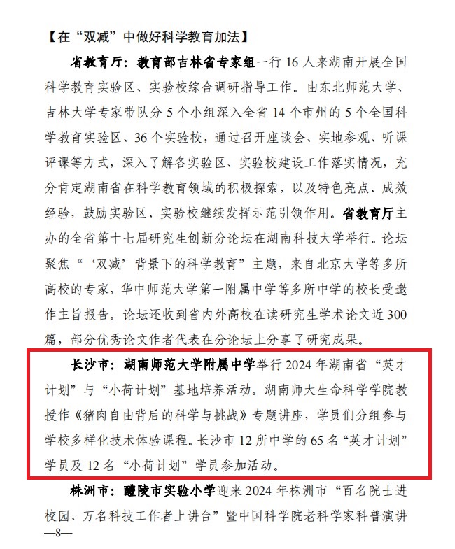 7月8日,《湖南教育快讯》第84期(“双减”改革工作专报 第3期)传来喜讯,湖南师范大学附属中学(湖南师大附中)在“双减”在“双减”中做好科学教育加法创新案例----“2024 年湖南省“英才计划”与“小荷计划”基地培养活动”获教育厅表彰。