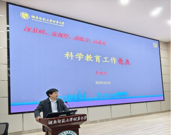 10月25日下午在惟一大讲堂,我校开展对外开放周--科学教育工作亮点分享。我校科技创新中心副主任李湘黔代表学校分享了科学教育工作亮点,李湘黔从下15个方面进行了系统的分享,具体内容为: 科学建模、“知行合一”全面实践育人、科学教育导师、科考、共建实验室、场馆建设、金牌摇篮、小中大一体化、院士进校月、科学教育信息化平台、英才计划、学生科学教育学术、学科科创项目、带着试题去旅行、研究真实实验教学、实践教学。会议由通用技术教研组长罗鹏飞老师主持,吸引了省内外200余名教师的积极参与,分享内容得到与会领导老师高度评价。