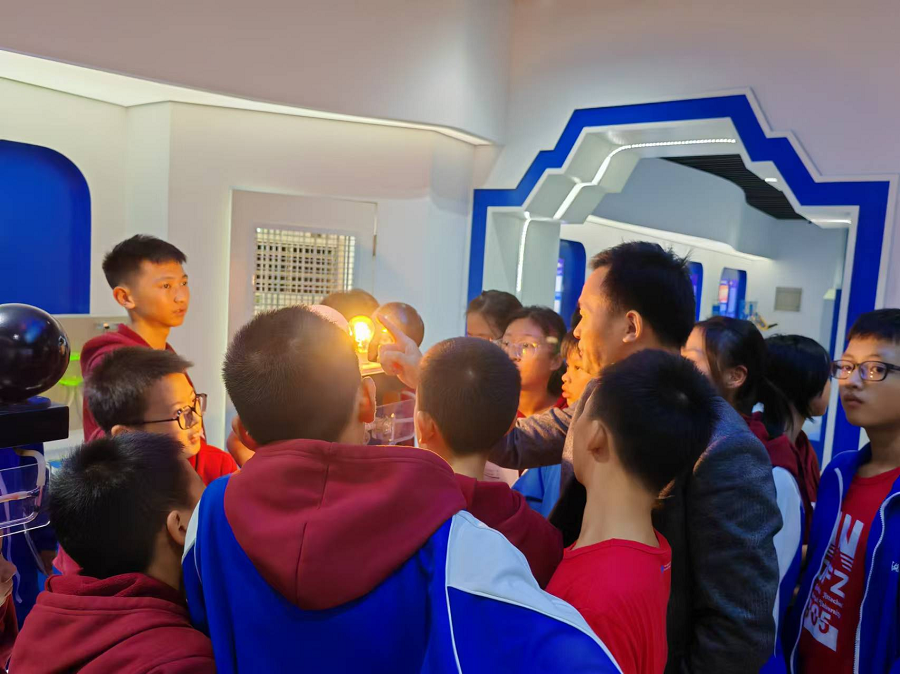 在分组参观环节,学生们被分为四个小组,依次参观了科普馆的经典力学、光学、电磁现象和量子物理四大展区。在经典力学展区,同学们通过互动装置,亲身体验了牛顿力学与机械原理;在光学实验区,大家观察了光的反射、折射现象以及光纤传导;在电磁现象区,同学们感受到了磁力与电力的关系,亲手操作了小型电磁实验;在量子物理区,学生们了解了量子物理的基本概念和应用,开阔了视野。