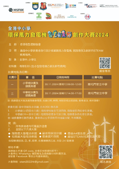 由香港模型运动协会主办的《全港中小学环保风力发电机STEAM创作大赛 2024》于11月30日在南屯门官立中学圆满结束.本次大赛吸引了来自38所中小学的近百支队伍参与,共同角逐六项大奖,充分展现了学生们在STEAM教育和环保创新领域的卓越才能。