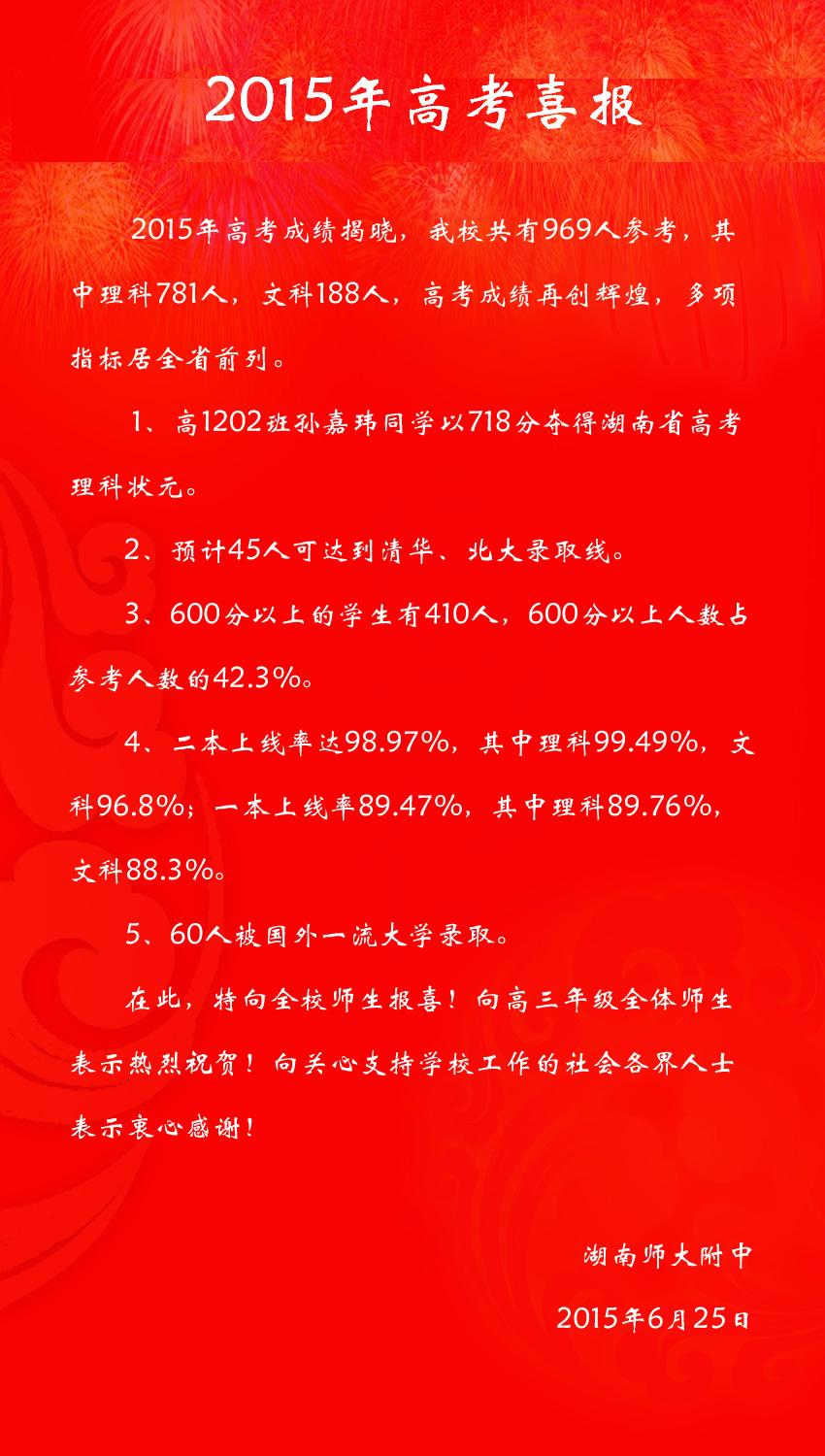 学校部门 部门新闻 工作动态 学科竞赛 科技创新 部门成员 部门简介 湖南师大附中2015年高考喜报和学科竞赛成绩 发布:科技创新处 来源:未知 日期:2018-09-30 人气:分享到: 上一篇:湖南师大附中2016年高考喜报和学科竞赛成绩 下一篇:媒体争相报道我校秦俊龙同学喜夺国际化学奥赛金牌 通知公告 更多 湖南师范大学附属中学2025年第二 湖南师范大学附属中学2025年教师 关于开展“科研优秀奖”评选活动 湖南师大附中2025-2026学年度第一学 湖南师范大学附属中学2025级新生 湖南师范大学附属中学大泽湖校区 最新动态 更多