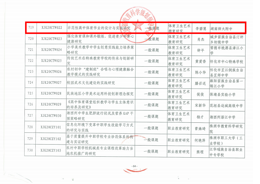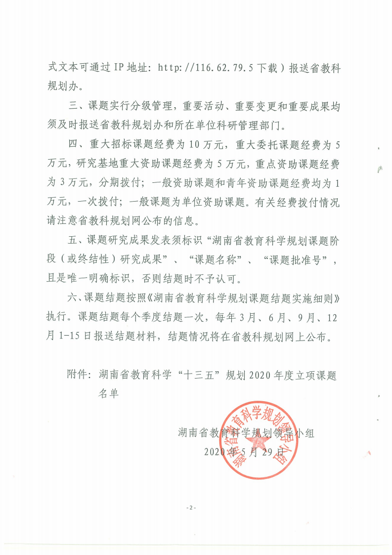 学校部门 省级课题 市级课题 校级课题 我校五项课题获准立项为湖南省2020年度规划课题 发布:管若婧 来源:科研与教师发展处 日期:2020-06-03 人气:分享到: 湖南省教育科学规划领导小组近日下发《关于下达湖南省教育科学“十三五”规划2020年度立项课题的通知》(湘教科规通[2020]2号),我校五项课题获准正式立项。其中,纪检书记李春莲主持的课题《新时代示范性高中师德师风建设校本研究》,被立项为湖南省“十三五”教育科学研究基地重大资助专项课题(课题批准号XJK20ZDJD14);党委书记黄月初主持的课题《普通高中学生生涯发展规划教育研究》(课题批准号XJK20BJC047)、长沙市赵优良中学数学名师工作室首席名师赵优良主持的课题《基于中学生数学核心素养发展的深度学习研究》(课题批准号XJK20BJC056),被立项为一般资助课题;英语教研组甘智英老师主持的课题《新高考背景下“以读促写”在高中英语教学中的应用研究》(课题批准号XJK20CJC010)、体育教研组李碧慧老师主持的课题《示范性高中体育作业的设计与实施研究》(XJK20CTW022),被立项为一般课题。 据悉,湖南省教育科学“十三五”规划2020年度立项课题分为本科院校、高职高专、省直单位、市州中小学和省级教育科学研究基地等多个部分,共立项研究基地专项课题15项、重点资助课题40项、一般资助课题240项、青年资助课题30项、一般课题420项。 上一篇:关于做好湖南省教育科学“十三五”规划2019年度专项课题申报工作的通知 下一篇:关于湖南省教育科学研究工作者协会2020年度科研课题申报工作的通知 通知公告 更多 2024年端午节放假通知 湖南师范大学附属中学2024年寒假 关于湖南师范大学开展“师大好网 湖南师大附中2024年端午节教职工 湖南师大附中2023-2024学年度考核工 湖南师大附中2024年公开招聘专任 最新动态 更多