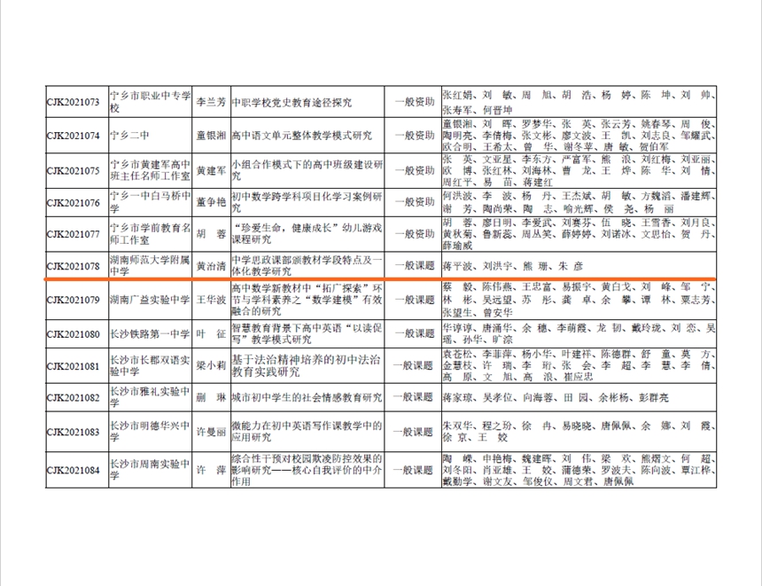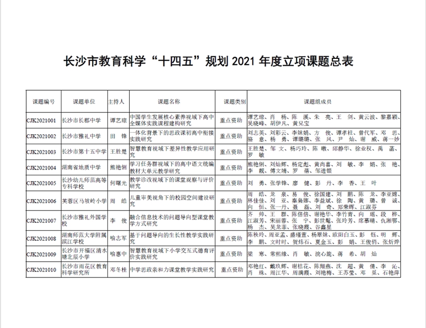 学校部门 省级课题 市级课题 校级课题 我校政治组课题获准立项为长沙市教育科学“十四五”规划一般课题 发布:管若婧 来源:科研与教师发展处 日期:2021-10-21 人气:分享到: 近日,长沙市教育科学研究院下达了《关于批准长沙市教育科学“十四五”规划2021年度课题立项的通知》(长教科通[2021]39号),政治组教师黄治清主持的课题《中学思政课教材学段特点及一体化教学研究》获准立项为市级一般课题。 该课题基于教学的学段特点展开一体化教学研究,切入点小而新,具有研究的理论和实践价值。同时,该研究使用教学实验法,研究问题来源于教师的教育教学实践,在实践过程中进行反思,不断更新教育理念和方法,在反思中得到启示、实施计划,反思问题,更好推动初高中思政课一体化教学。 该课题为我校政治教研组重点推出的研究课题,主要研究人员有黄治清、蒋平波、刘洪宇、熊珊、朱彦等老师,研究周期为2至3年。 上一篇:学校参加长沙市教育科学规划课题集中开题活动 下一篇:学校参加长沙市教育科学规划课题集中开题活动 通知公告 更多 2024年端午节放假通知 湖南师范大学附属中学2024年寒假 关于湖南师范大学开展“师大好网 湖南师大附中2024年端午节教职工 湖南师大附中2023-2024学年度考核工 湖南师大附中2024年公开招聘专任 最新动态 更多