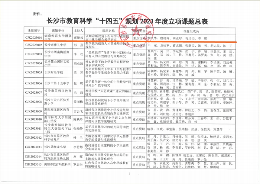 近日,长沙市教育科学研究院下达了《关于批准长沙市教育科学“十四五”规划2023年度课题立项的通知》(长教科通[2023]37号),化学组教师蒋艳云主持的课题《认知诊断视角下指向学习进阶的高中化学概念教学研究》获准立项为重点资助课题。
