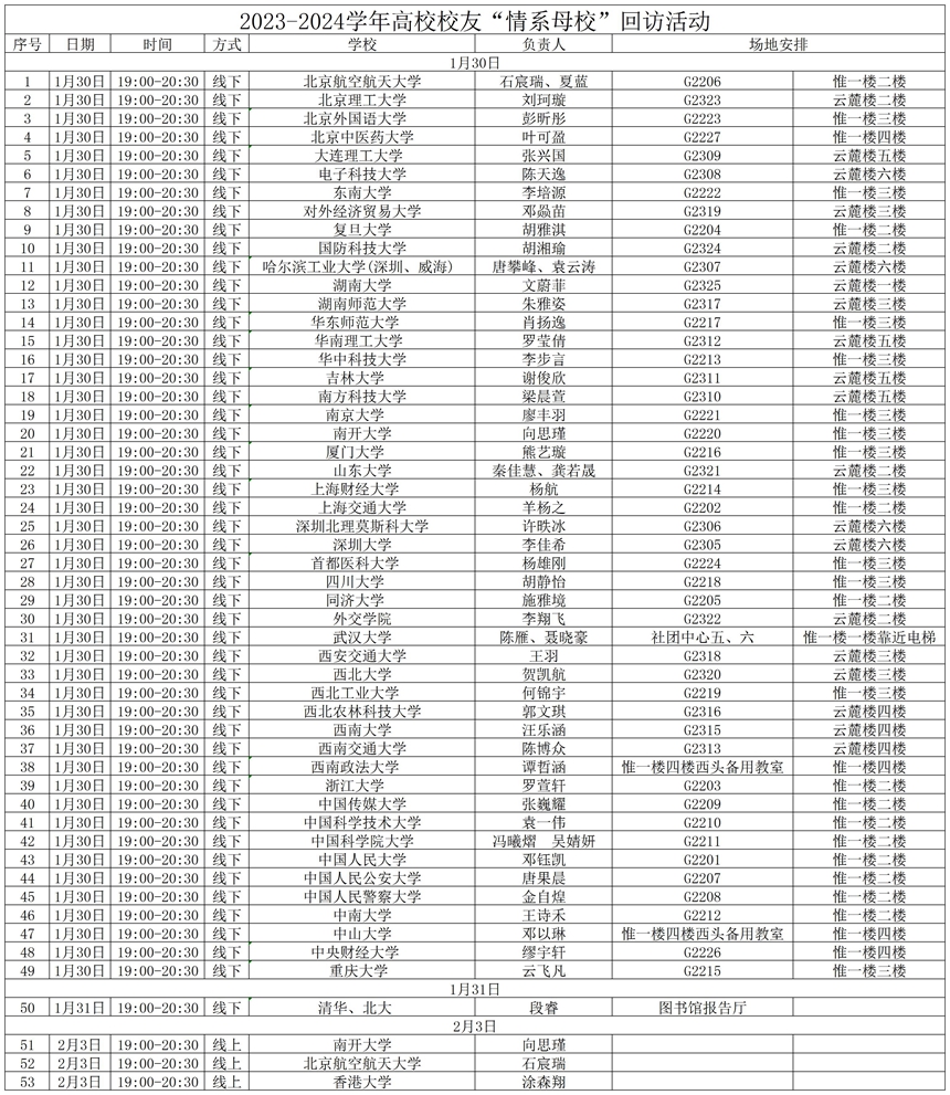 为给予21级学弟学妹们鼓励,了解学长学姐成功实现目标的经验,同时帮助他们确立目标,增强信心并对目标院校进一步了解,我校特联合各高校校友开展2023-2024学年高校校友回校宣讲,为21级学弟学妹们送上祝福与鼓舞。