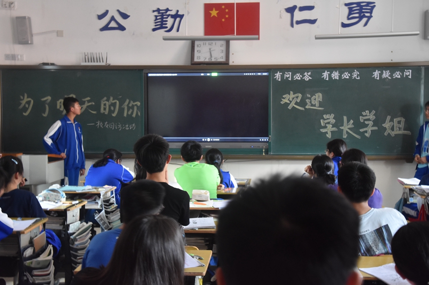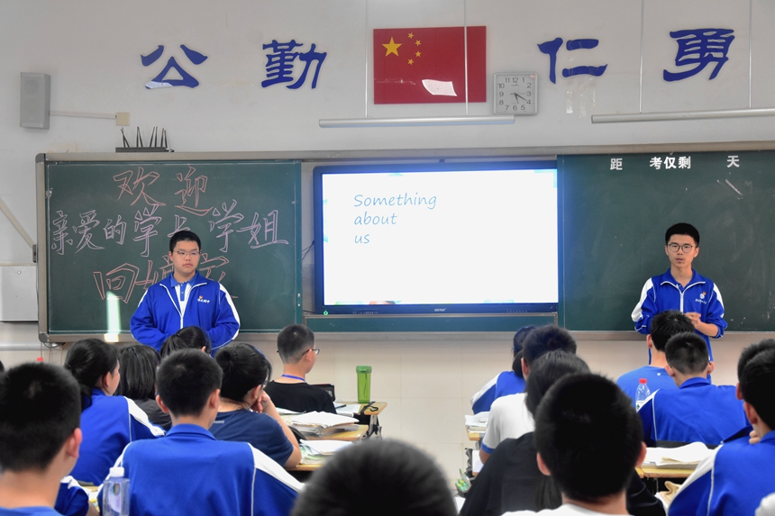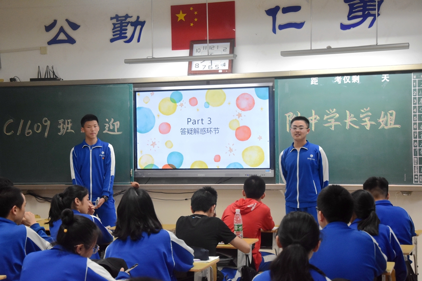 随后,九年级各班团支书将回访团成员带到了各班,开始了本次回访宣讲活动。回访团的同学们准备充分、举止大方而幽默风趣,师梅九年级学生们听讲认真、主动参与,现场气氛活跃;提问环节,师梅学子十分热情,与回访团同学积极交流。许多回访团同学都准备了附中的特色文化产品与学习用品赠送给学弟学妹,更有细心者准备了点燃斗志的中考寄语,调动了大家的积极性,提升了师梅九年级学生的自信,增进了他们对附中的理解认知。