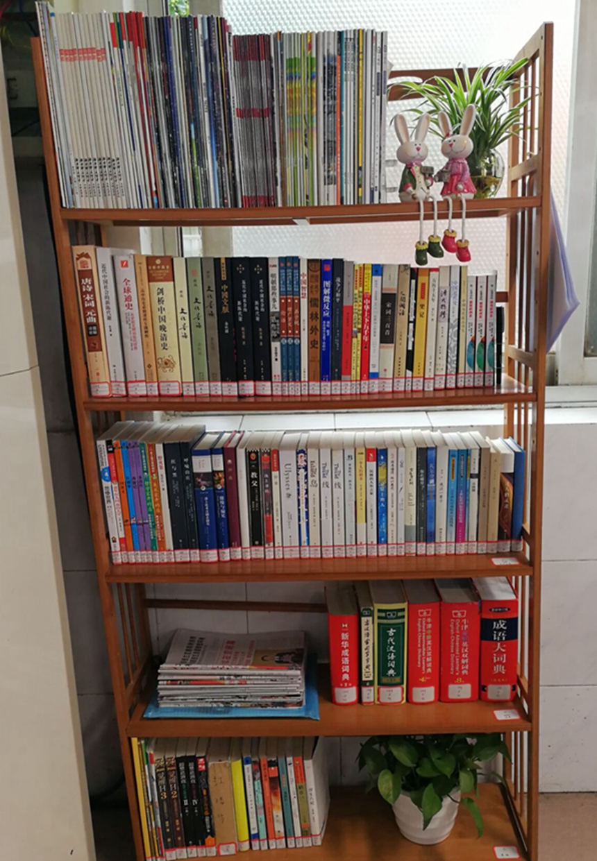 活动之一:班级图书角评比。各班立足实际,在班主任的指导下,充分利用有限的空间,精心设计,巧妙布局。从内容来看,有洗涤心灵的唐诗宋词、引人深思的经典名著、教人智慧的哲学读本等;从视觉效果来看,很多班级别出心裁,或以盆栽点缀,或以玩偶装扮。各种各样被分门别类整齐有序摆放的书籍成为班级一道靓丽的风景线,各式装饰让宁静的一隅多了些灵动和温馨。